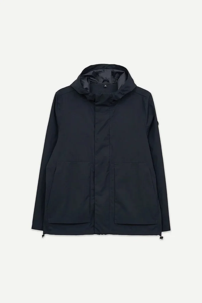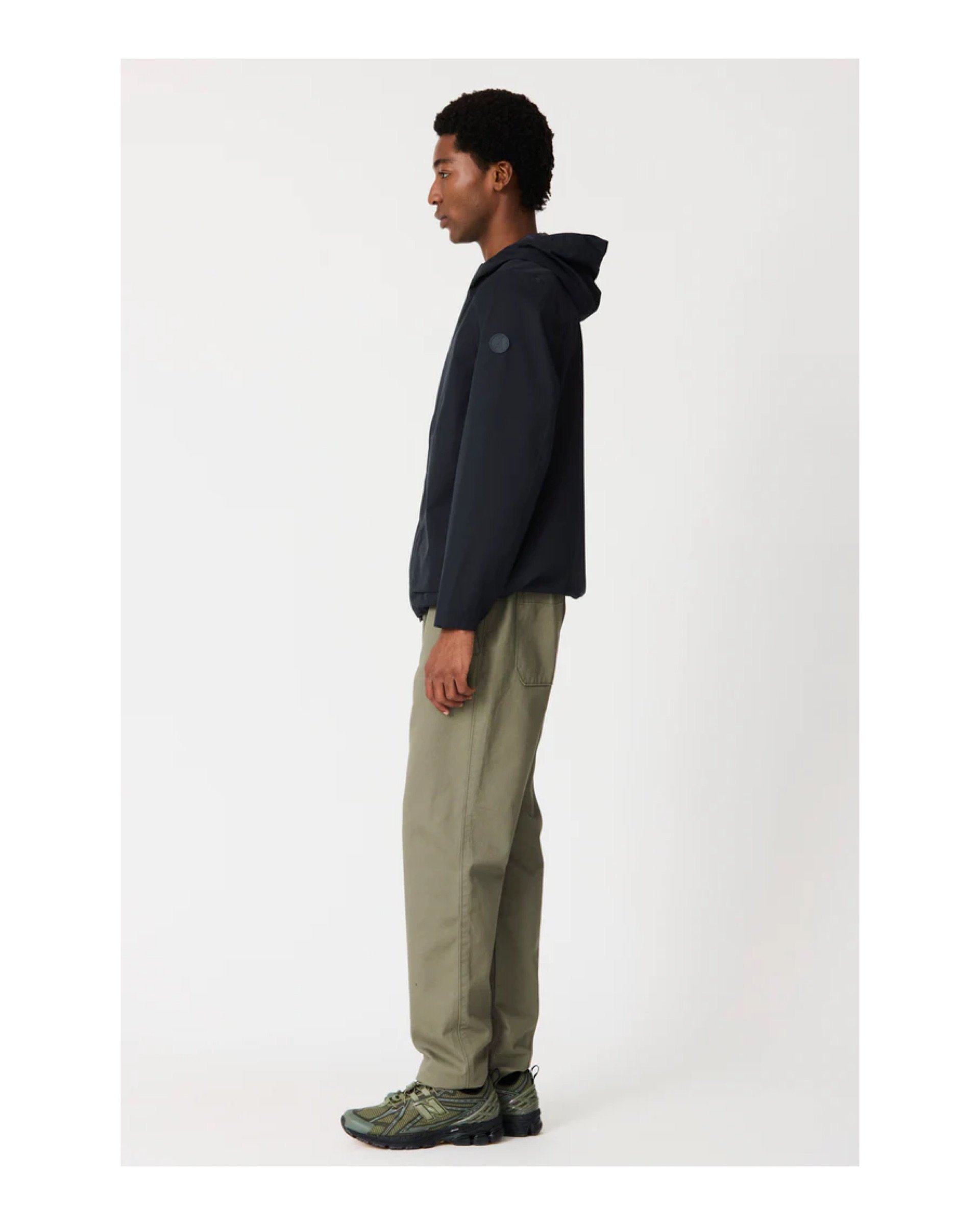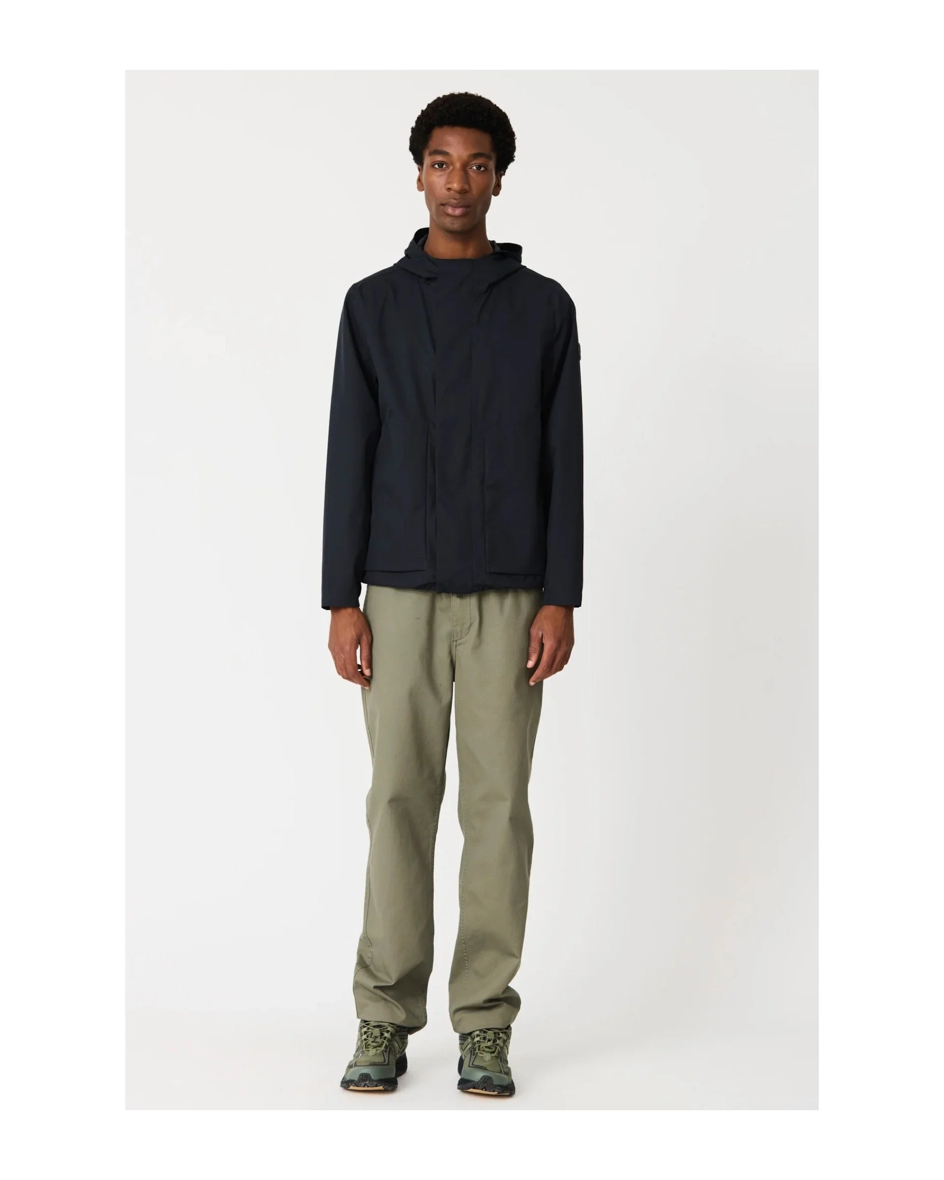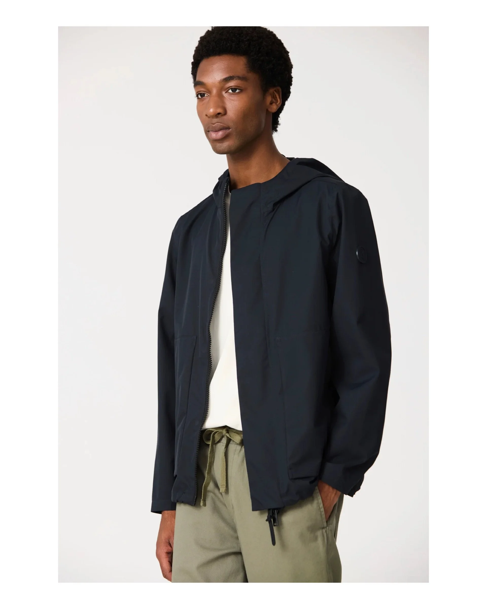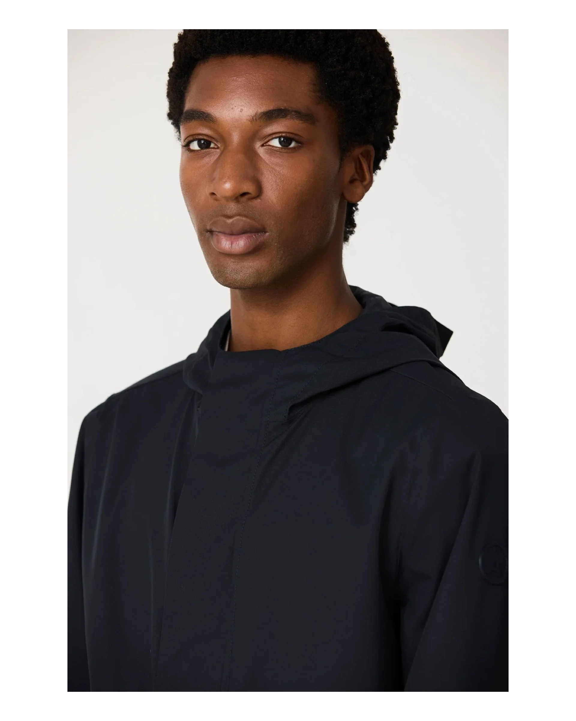 Adjustable hood with drawstring, with integrated visor and high collar.