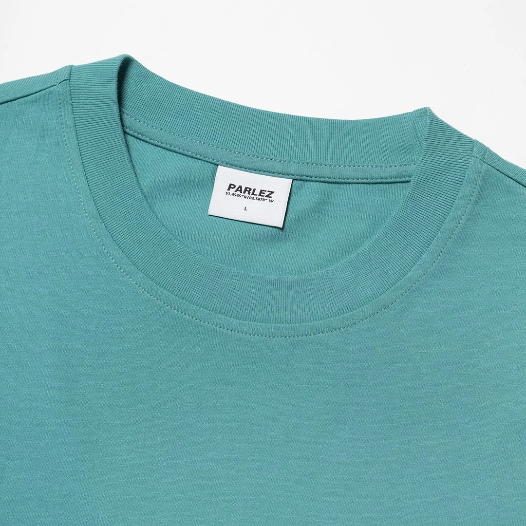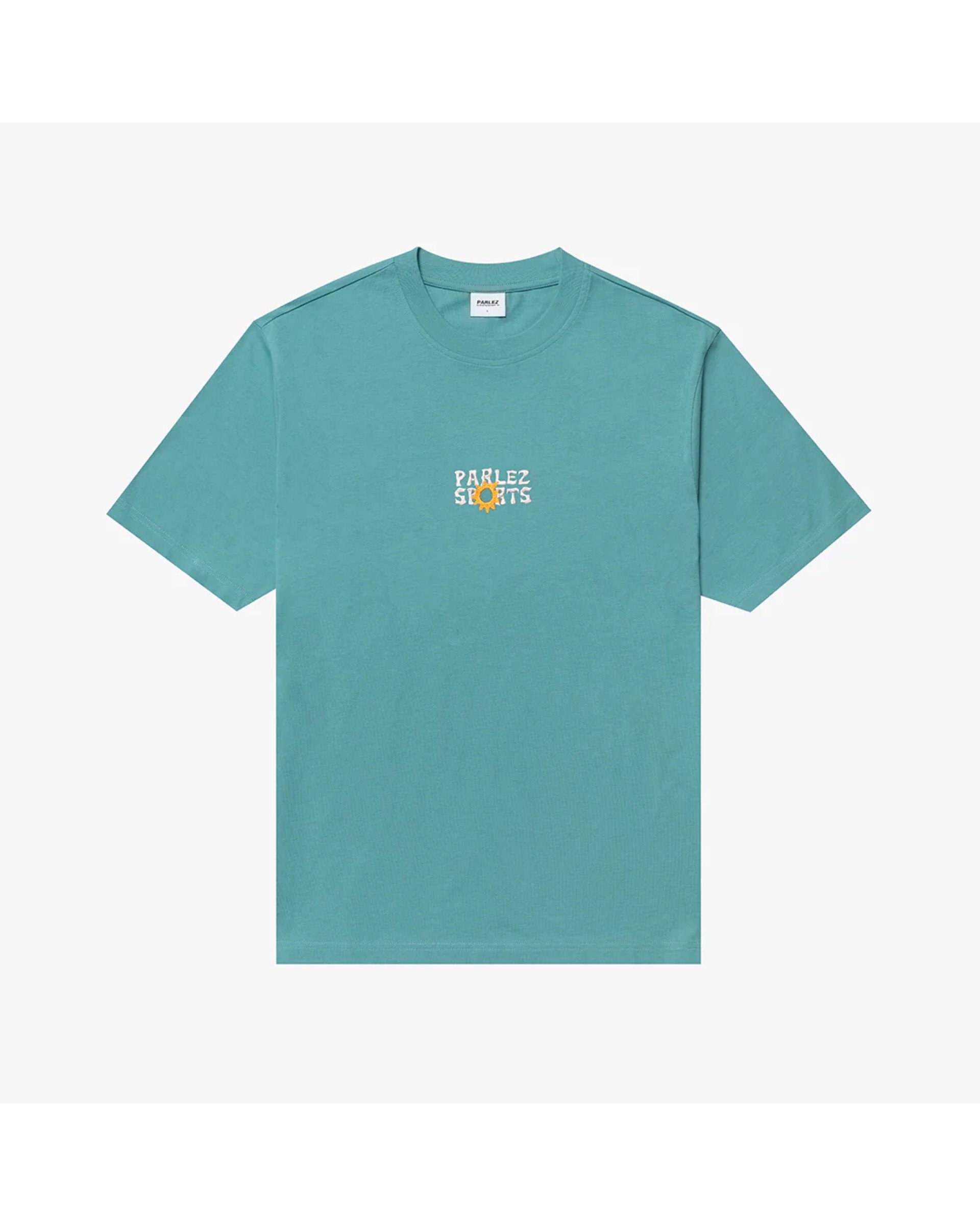 The Celeste T-Shirt in Leaf. A short sleeve tee crafted from premium GOTS Certified, 100% organic cotton with a classic ribbed crewneck. Detailed with an embroidered sun design on the chest.