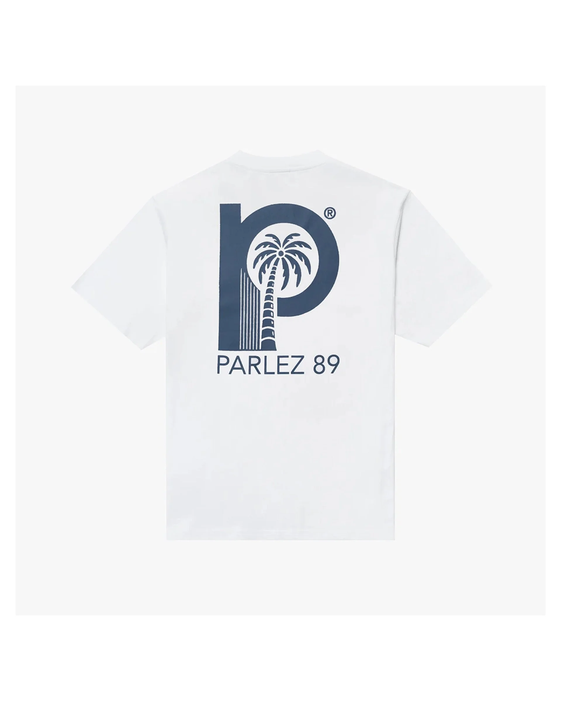 The Delray T-Shirt in White. A short sleeve tee crafted from premium GOTS Certified, 100% organic cotton with a classic ribbed crewneck. Detailed with a small, printed logo on the chest and a large palm design on the back.