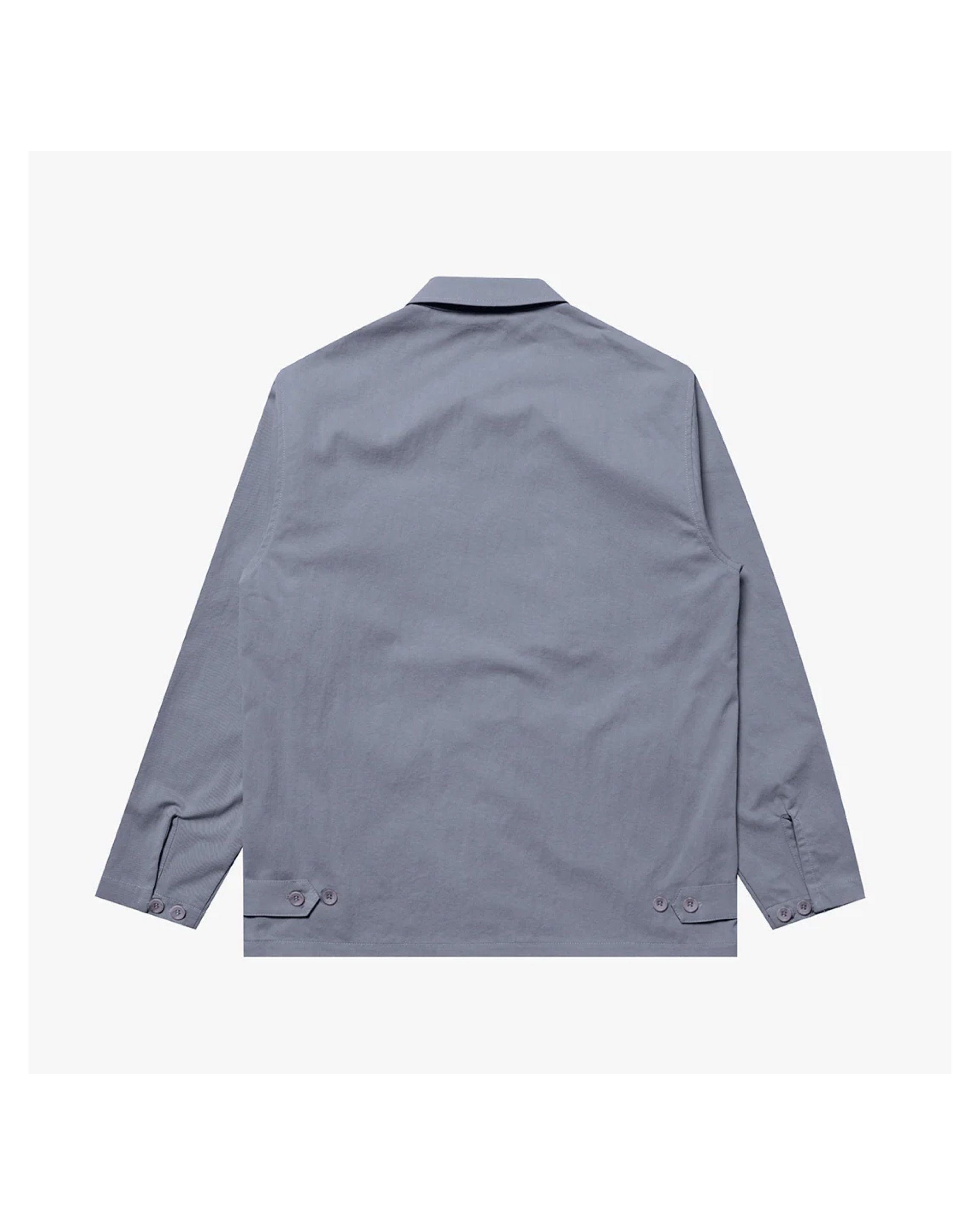 The Paris Jacket in Slate Blue. A button-through overshirt with a classic spread collar, made from premium 100% organic cotton twill. Featuring dual chest pockets, two vertical welt pockets and adjustable button cuffs. Detailed with embroidered script branding and stitching detail at the pocket.