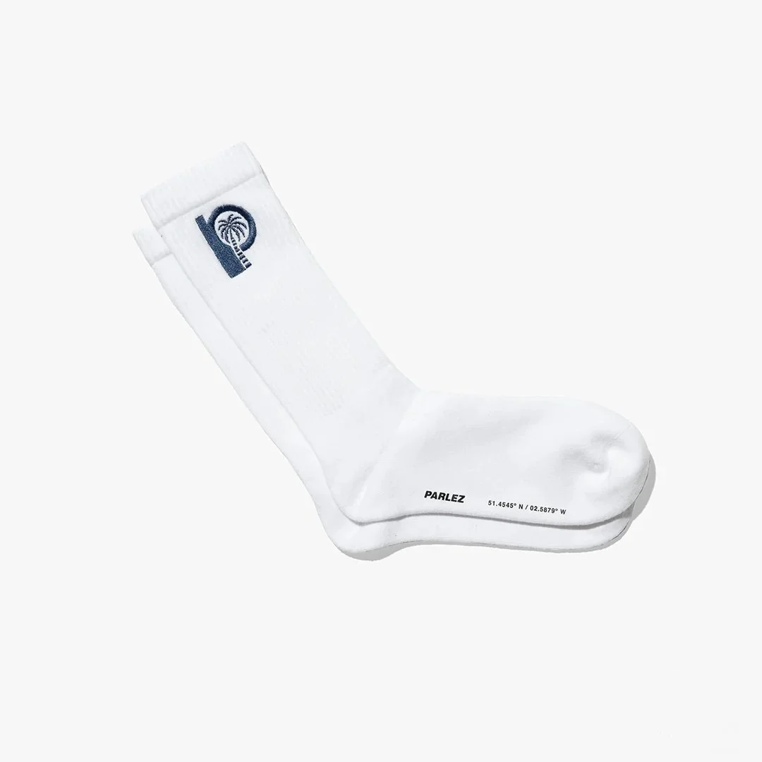 The Ultra Socks in White. Mid-calf, ribbed sports socks made from a soft, organic cotton blend. Featuring an embroidered palm design on the cuff and a printed logo & co-ordinates on the sole.