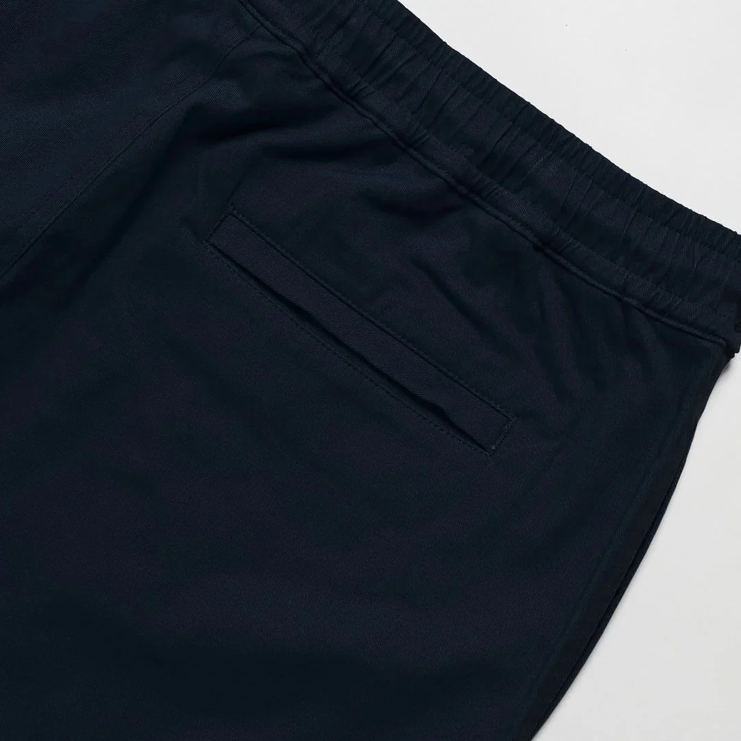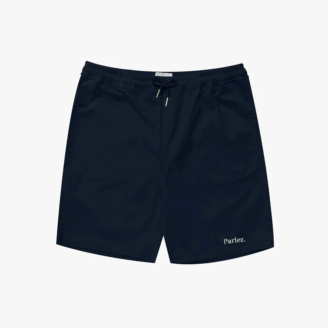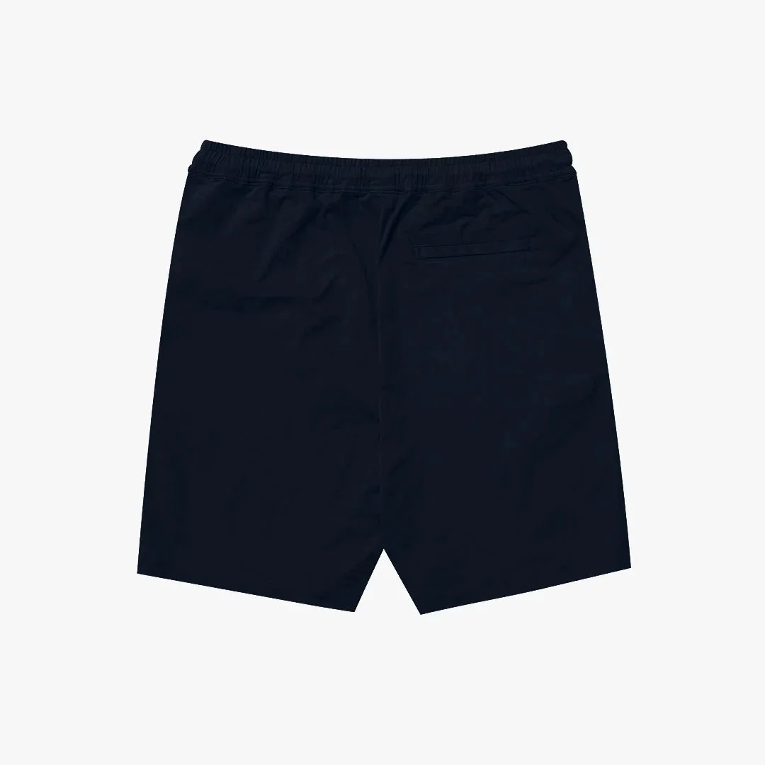 The Arc Shorts in Midnight. Relaxed-fit, mid-length shorts cut from a durable organic cotton blend. Designed with an elasticated drawstring waist, two side seam pockets, and a single back pocket. Branded with an embroidered logo on the hem.