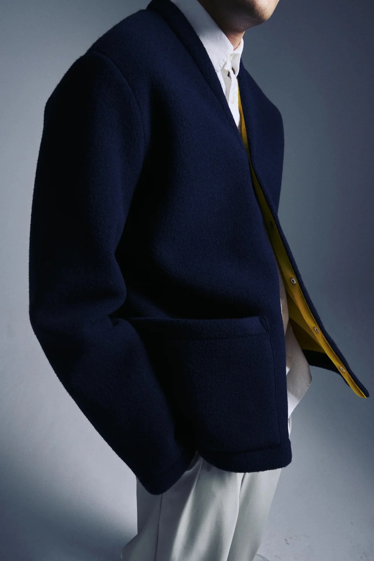 This is where tradition meets modernity. Unfeigned have taken a step further and chose a cozy and traditional fabric made of virgin wool but gave it a twist using a neoprene lining. Because a good contrast makes the difference. Straight and clean cuts, snap buttons and pockets to deliver a day-to-day piece that will make your look stand out.
