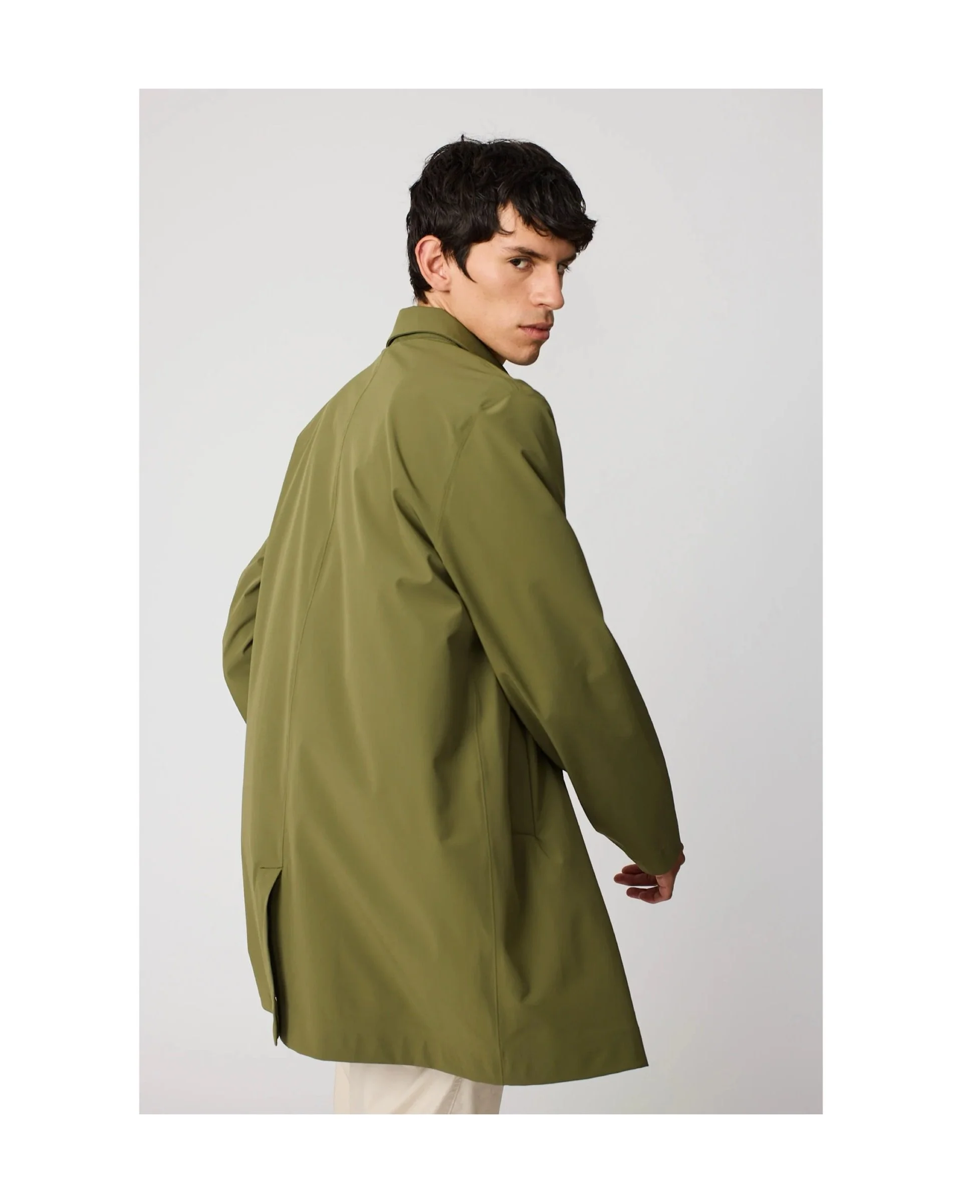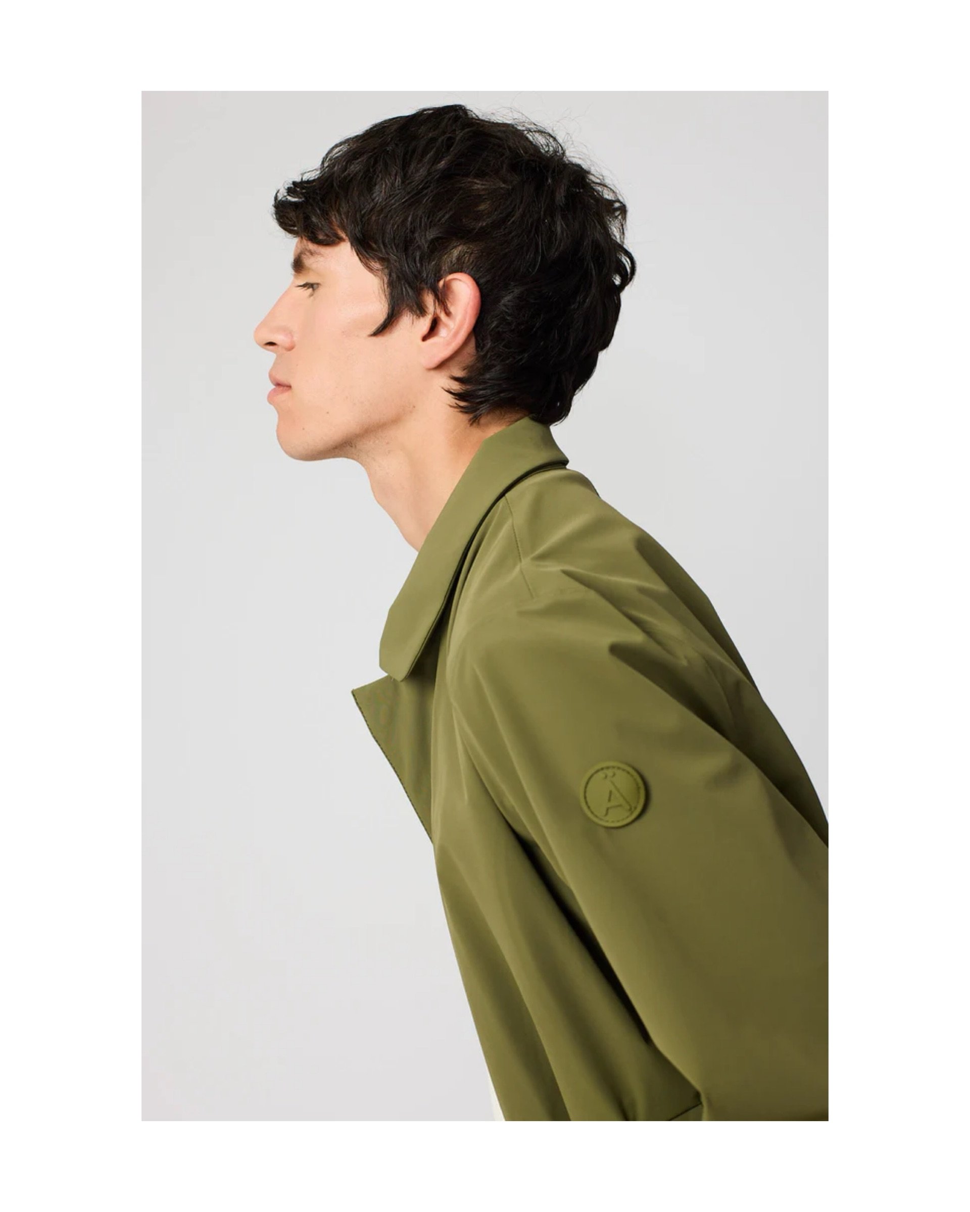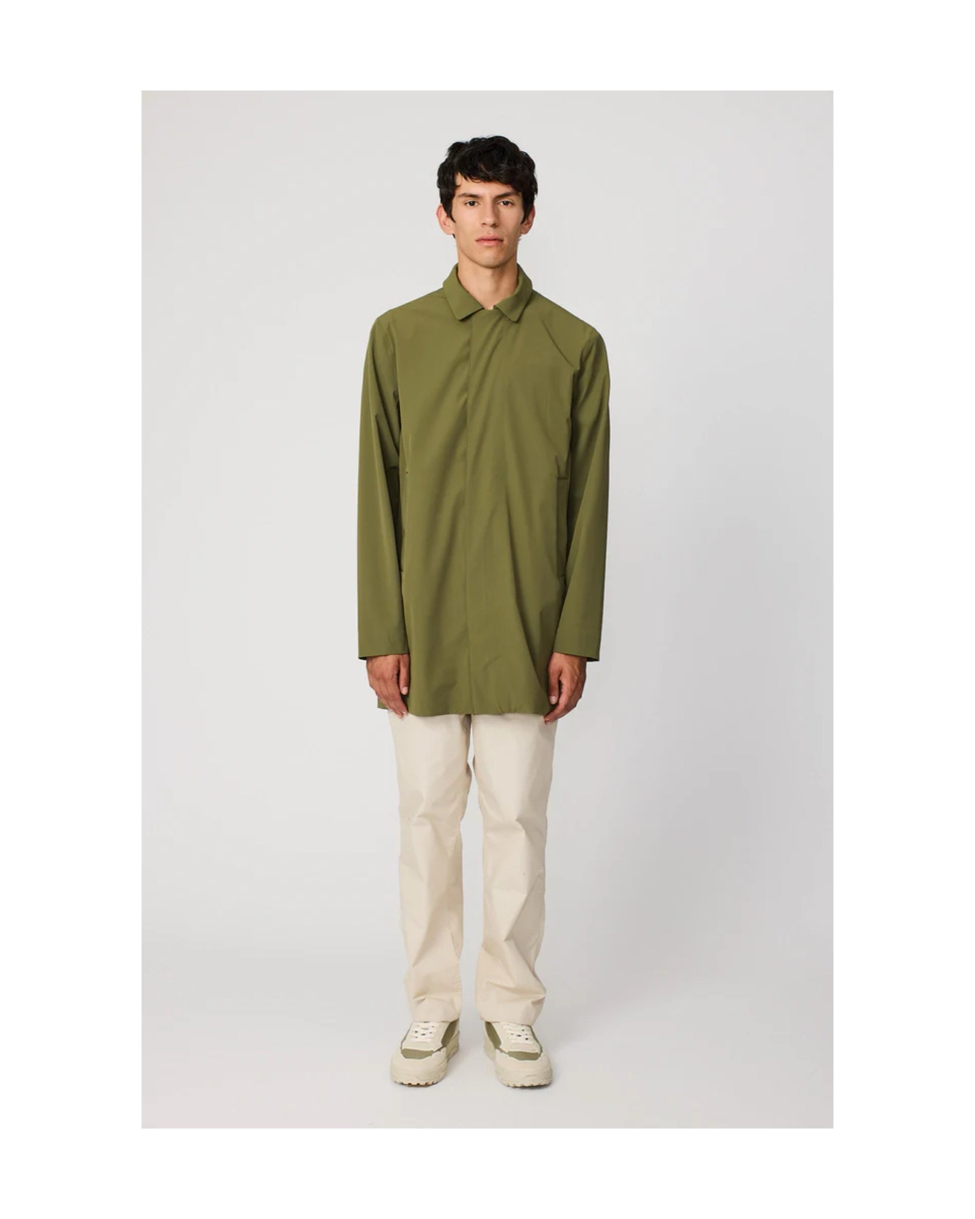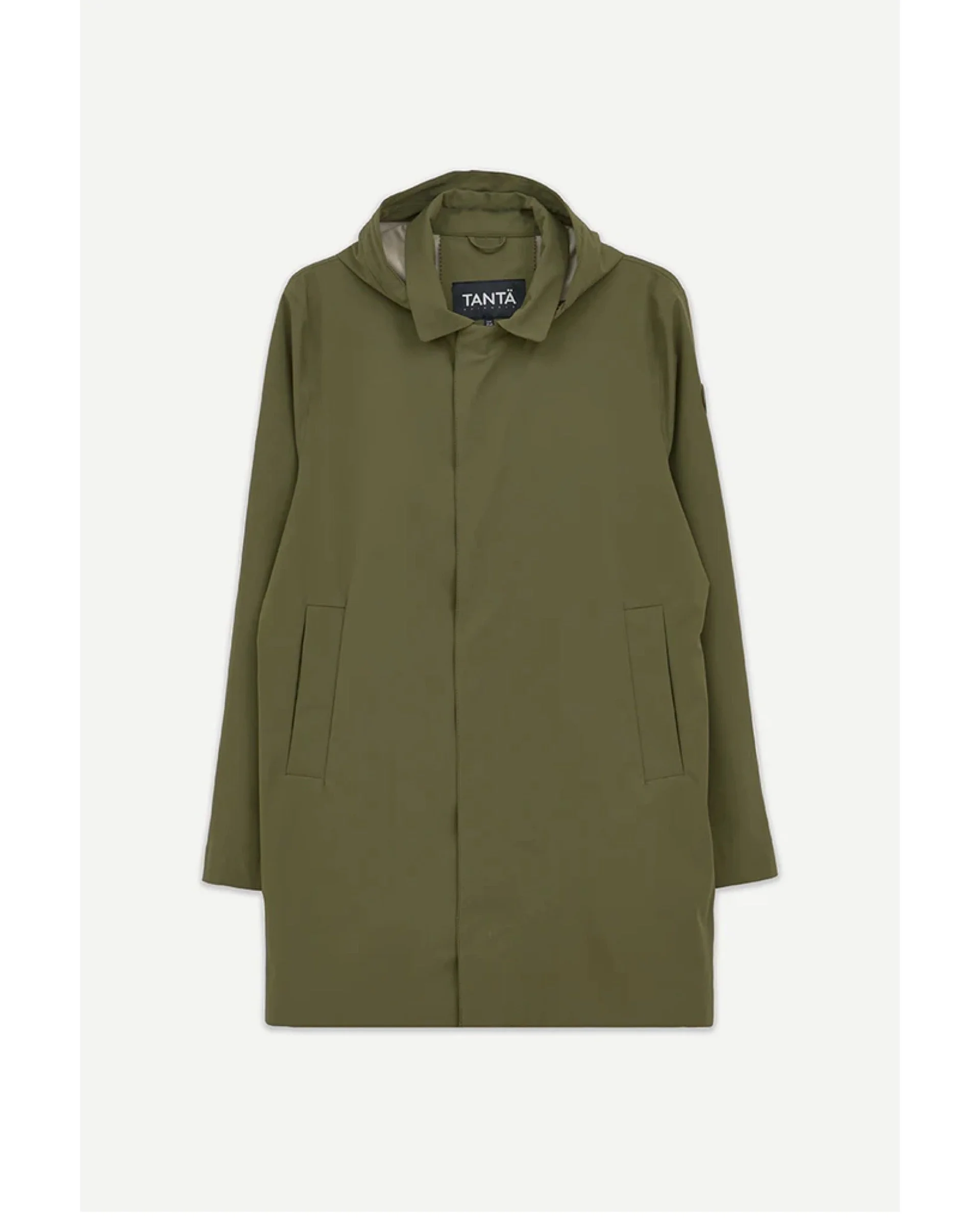 Detachable hood with drawstring, attached to the neck with snaps.